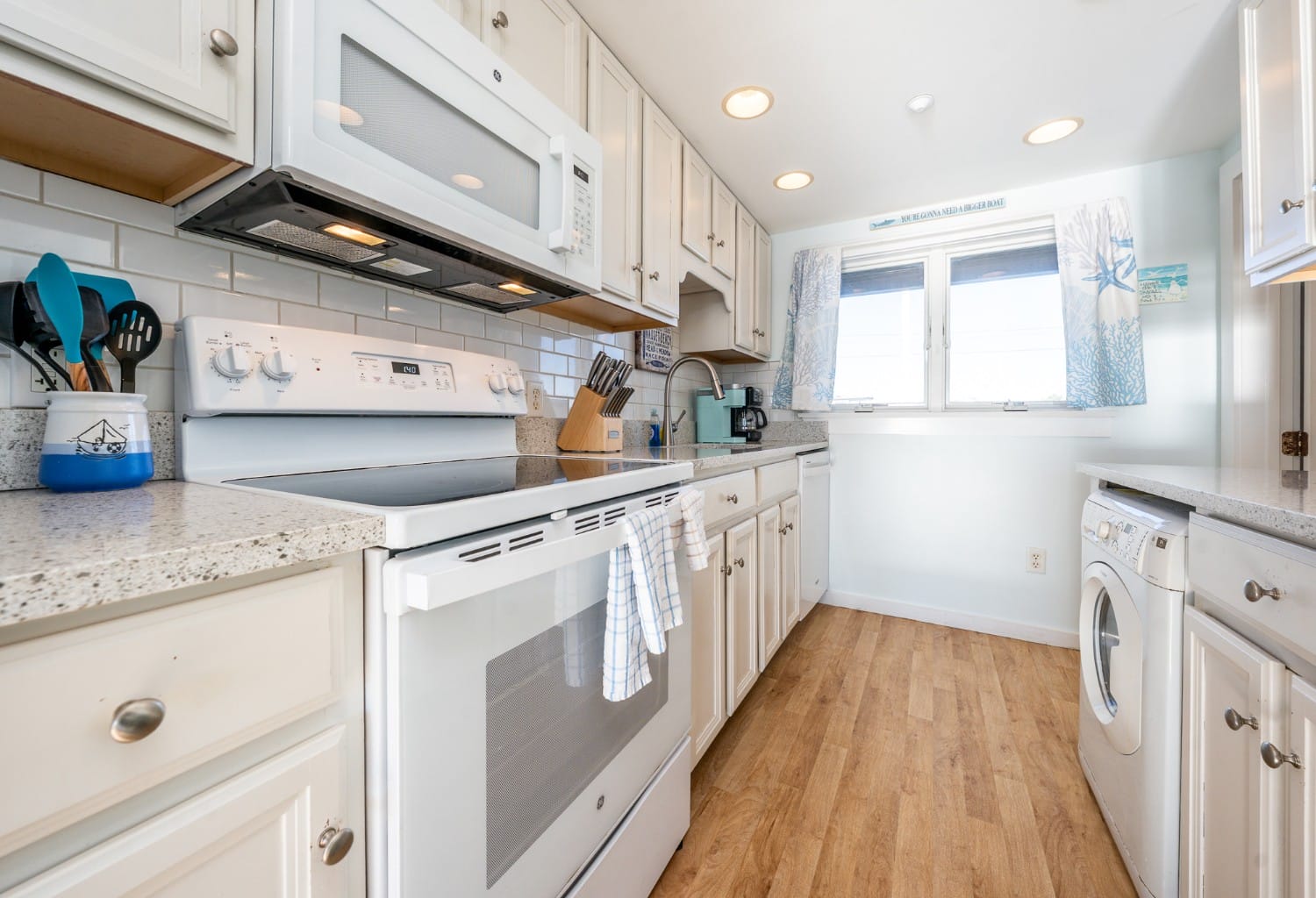 We supply coffee maker, toaster, blender, telephone, Cable TV with HBO, DVD, pots, pans, utensils, other kitchen supplies, lobster pot, plates, glasses, silverware, iron & ironing board, hair dryer, toilet paper, dishwashing liquid, washing machine liquids, all bedding with sheets and blankets as well as all bath towels.