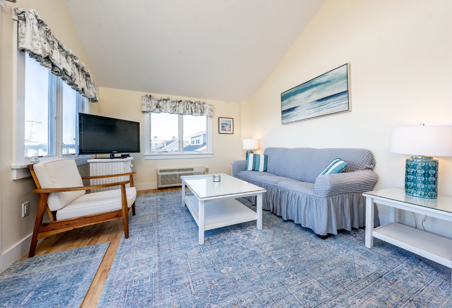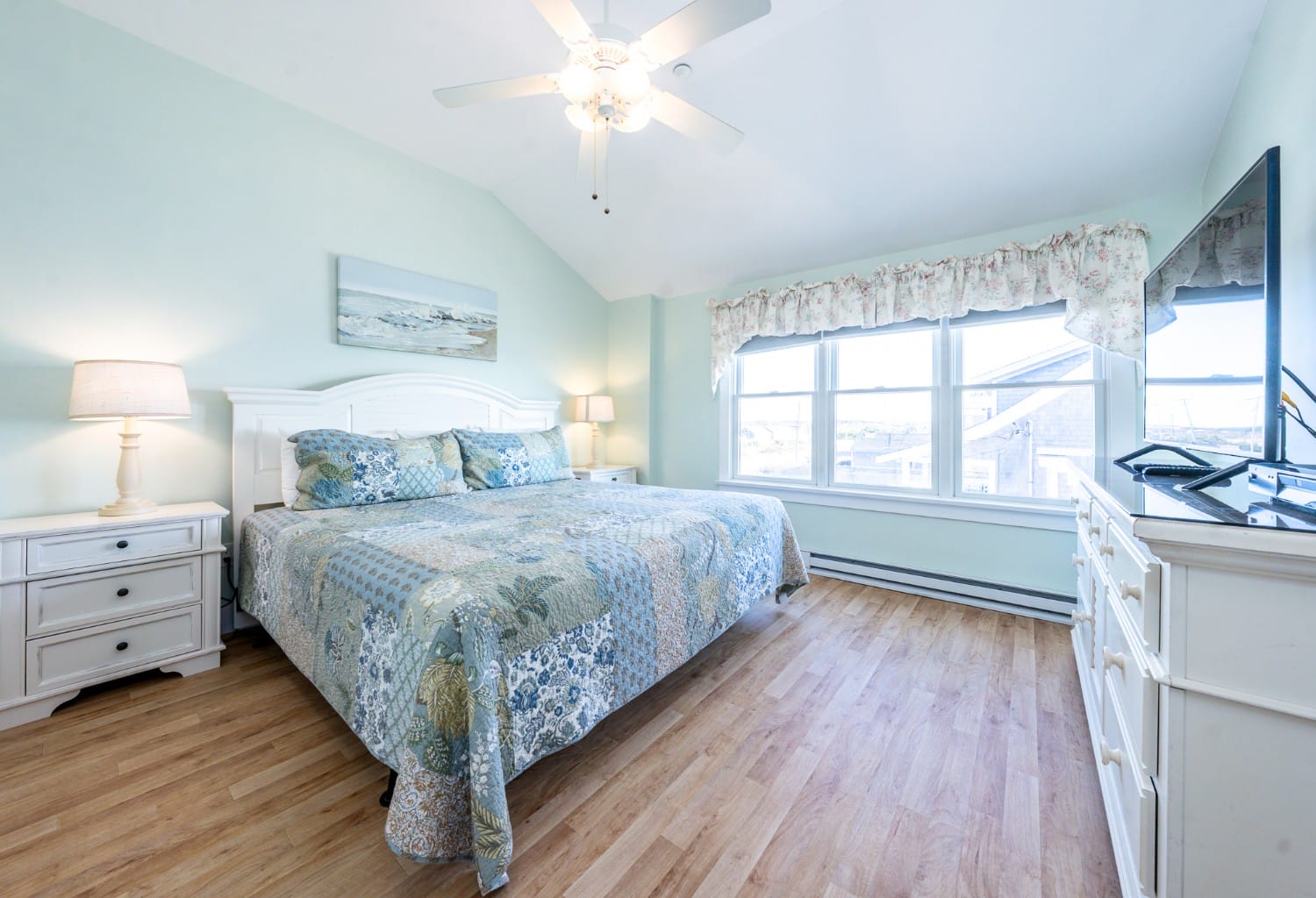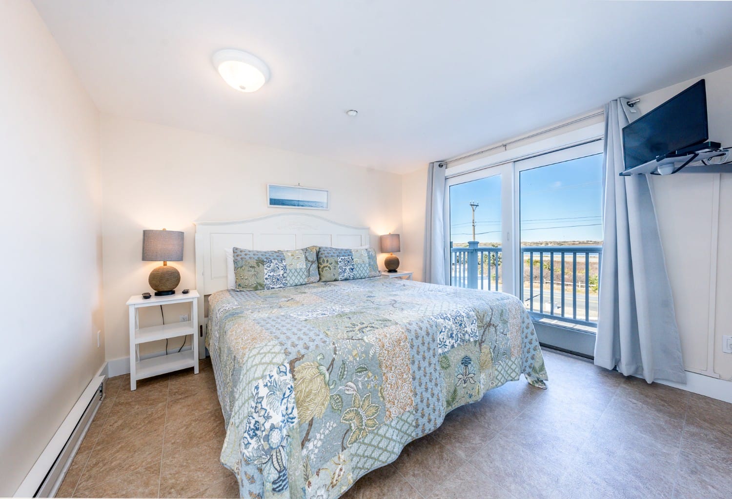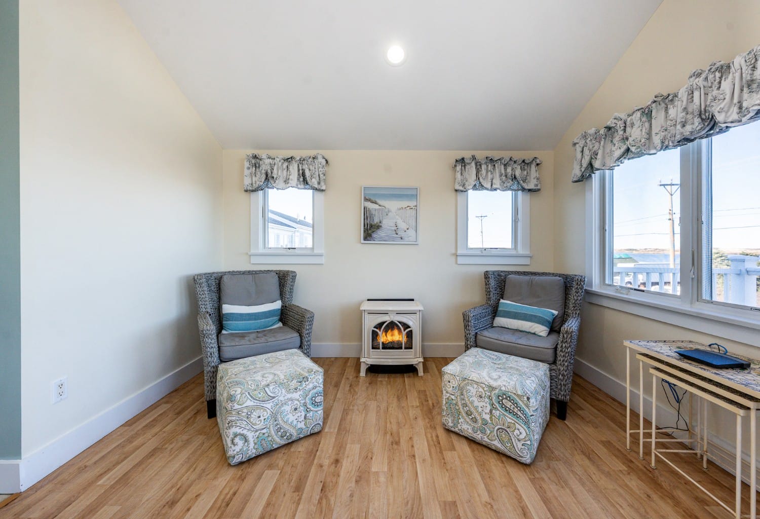 The Ultimate! The Captain’s Quarters is our largest suite with three bedrooms. Bedroom 1 is a king size bed, bedroom 2 is a queen and bedroom 3 includes 2 twin beds. Additionally, there is a queen sleeper is our spacious Sun Room. In all up to 8 people can be accommodated. Our large open concept living kitchen and dinning room with 20’ cathedral ceiling is inviting and spacious. Our separate Sun Room is our 2nd seating and entertainment area complete with additional fire place and A/C. There are also 2 full baths and stackable washer/dryer as well.
